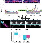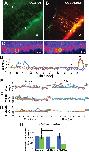 Visual stimulation regulates calcium transients and filopodial motility of radial glia. A, Two-photon optical section at two time points through glial cell body layer loaded by ventricular injection of OGB-AM. B, ÎF/Fmean of calcium signal for 10 glia indicated by the colored circles in A, before and after the contralateral eye was stimulated for 2 min. C, Time series of glia expressing EGFP-F collected at 15 min intervals, before and after 5 min of visual stimulation. Blue area corresponds to the retinorecipient outer one-third and the pink area to the inner two-thirds of the neuropil (the boxes represent the part of the cell shown at higher magnification in the right panel). D, Visual stimulation induced a net increase in glial motility selectively in the retinorecipient outer one-third of the neuropil. In contrast, the entire cell is sensitive to general NMDAR blockade by MK801 treatment. Scale bars: A, 15 μm; C left panel, 30 μm; C right panel, 7 μm. *p < 0.05; **p < 0.01, two-tailed paired t test comparing motility before and after visual stimulation or drug treatment. Error bars are SEM. |