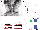 NMDARs are not expressed in radial glia. A, In situ hybridization against NR1 mRNA in stage 48 tadpole brain section shows no staining of radial glial cell bodies that line the ventricle (arrow). B, Morphologically identified radial glia cells were readily distinguishable from neurons based on overall larger capacitances and consistently lower input resistances in whole-cell recordings. C, Representative current traces of a neuron (red) and a glia (black) in response to a 100 ms puff of 100 μM NMDA onto the cell clamped at â60 mV (left) and +40 mV (right) in absence (top) or in presence (bottom) of the NMDAR antagonist CPP (100 μM). D, Mean response amplitudes generated in neurons (left) and glia (right) after an NMDA puff in the absence (top) or in presence (bottom) of CPP at different holding potentials. Because CPP blocks the classic NMDAR current in neurons, but not the outward current seen in hyperpolarized glia, this glial current is probably not mediated by NMDARs. Scale bar, 50 μm. Error bars are SEM. |