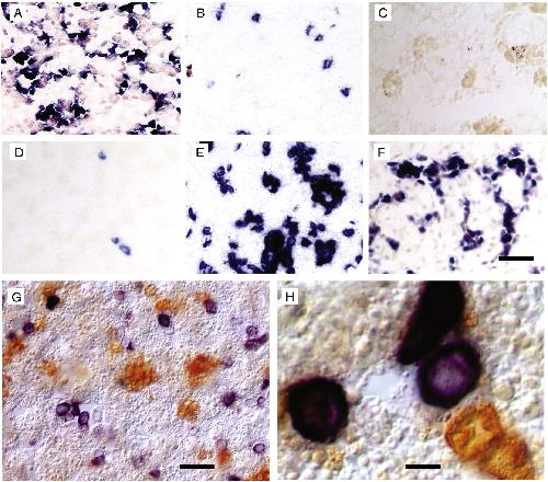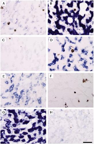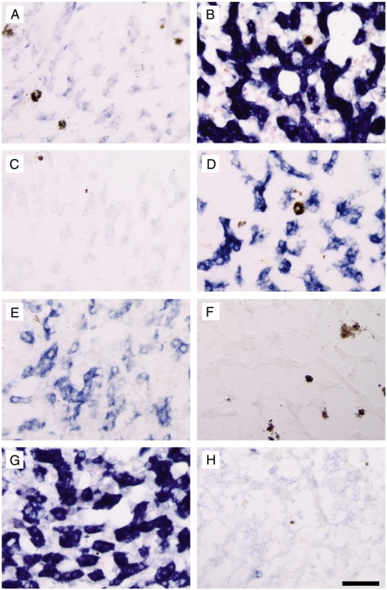 Fig. 7. Switching of globin-containing red blood cells from larval type to adult type occurs at climax in the liver. In situ hybridization with (AâC) tadpole globin; (DâF) adult globin; (GâH) tadpole globin (red) and adult globin (purple). (A, D) NF55; (B, E, G, H) NF62; (C, F) frog liver. There was no co-localization of the two probes (G and H) at climax. Scale bar = 40 μm for AâF; 20 μm for G; 10 μm for H. |