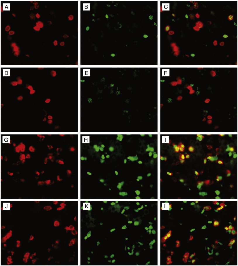 Fig. 8. Labelling of tadpole and adult red cells with BrdU at different times before and after TH treatment. (AâF) BrdU was injected 24 h before the addition of 10 nM T3. Three days later the livers were analyzed. (GâL) BrdU was injected after 48 h of 10 nM T3 treatment. The livers were isolated after another 24 h. (AâC and GâI) tadpole globin; (DâF and JâL) adult globin. (A, D, G, J) in situ hybridization (red). (B, E, H, K) BrdU immunocytology (green) of the adjacent sections; (C, F, I, L) merge of the adjacent two sections. Scale bar = 20 μm. |
