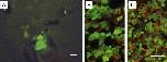 Fig. 5. The liver fatty acid binding protein (L-FABP) promoter from zebra fish expresses GFP specifically in the liver parenchymal cells. (A) Liver fluoresces in a low power ventral abdominal view of a NF55 tadpole transgenic for L-FABP-GFP; (B) section of the liver of the animal shown in (A) showing cytoplasmic expression of GFP in parenchymal cells. (C) Section of a NF55 liver of a tadpole transgenic for the tet inducible L-FABP-TRDN-GFP. This transgene is visualized in the nucleus. B and C are doubly stained with antibodies against E-cadherin (red) and GFP (green). Scale bar is 1 mm for A and 40 μm for B and C. |