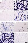 Fig. 4. Gene switching in liver parenchymal cells. In situ hybridization with (AâC) fetuin B; (DâF) serum albumin. (A, D) NF55; (B, E) NF60; (C, F) adult frog. Sections from the same stage are consecutive. Transition from larval to adult cell type happens at climax without significant cell replication or cell death. Scale bar = 100 μm. |