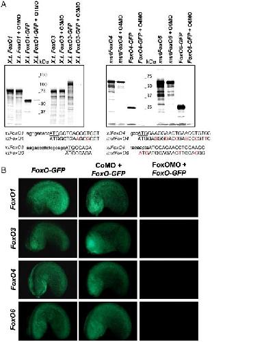 Fig. 8. FoxO proteins affect apoptosis. (A) Embryos were injected at 2-cell stage with the same amounts as given in Fig. 7. At stage 11.5, embryos were analyzed for apoptosis by TUNEL (animal view) and for caspase activities using caspase 8, 9 and 3/7 Glo assays. (B) Embryos injected with FoxO3MO and corresponding controls were analyzed by TUNEL at stage 15 (dorsal view, left), embryos injected with FoxO1MO, FoxO4MO or FoxO6MO were analyzed at stage 26 (lateral view, bottom). Caspase 8, 9 and 3/7 activities were determined at stages 19 and 26, respectively. |