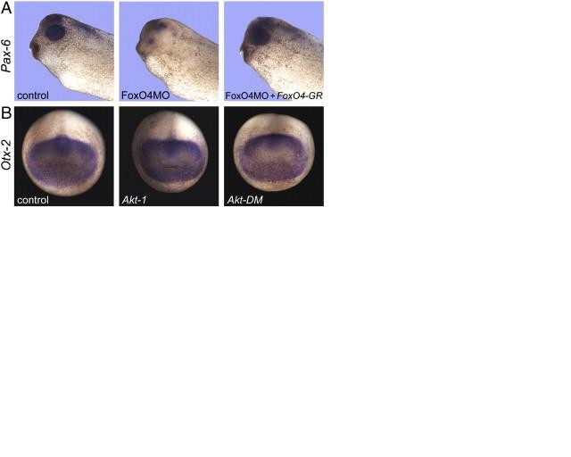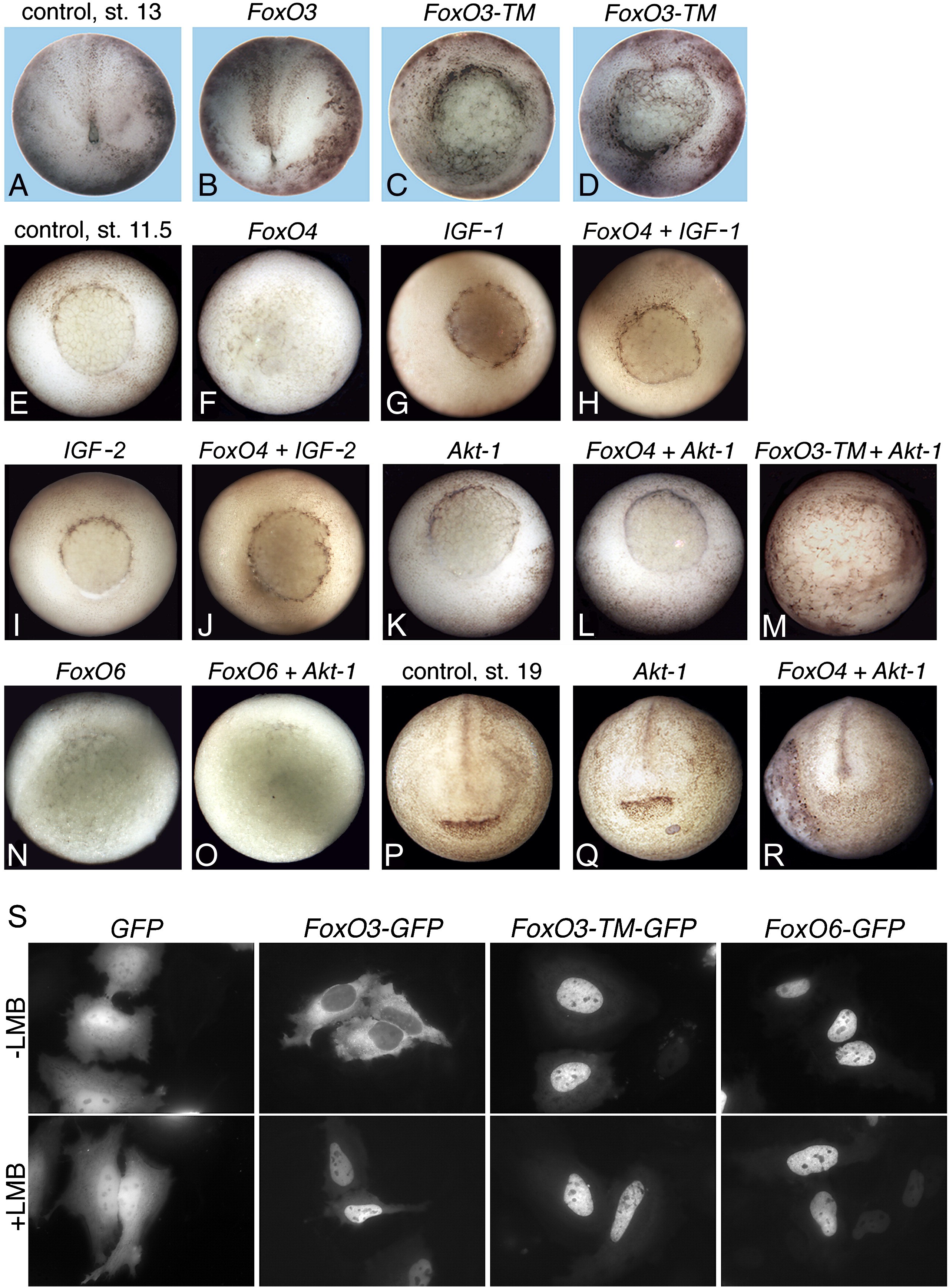 Fig. 4. FoxO overexpression phenotype depends upon Akt phosphorylation status. (A) Uninjected control embryo at stage 13. (B) Bilateral injection of 500 pg FoxO3 RNA does not reveal major phenotypic alterations. (C, D) Bilateral injection of 250 pg (C) or 500 pg FoxO3-TM RNA (D) prevents blastopore closure. (E) Uninjected control embryo at stage 11.5. (F) Bilateral injection of 400 pg FoxO4 prevents blastopore formation. (G) Bilateral injection of 300 pg IGF-1. (H) Co-injection 300 pg IGF-1 and 400 pg FoxO4 RNA restores blastopore formation. (I) Bilateral injection of 400 pg IGF-2. (J) Embryo, co-injected with 400 pg FoxO4 and 400 pg IGF-2 RNA, is rescued to wild type. (K) Bilateral injection of 500 pg Akt-1 RNA. (L) Embryo, co-injected with 400 pg FoxO4 and 500 pg Akt-1 RNA, is rescued to wild type. (M) Embryo, co-injected with 400 pg FoxO3-TM and 500 pg Akt-1 RNA, stage 11.5. The wild type phenotype cannot be restored. (N) Bilateral injection of 200 pg FoxO6 prevents blastopore formation. (O) Embryo, co-injected with 200 pg FoxO6 and 500 pg Akt-1. Blastopore formation fails. (P) Uninjected control embryo, stage 19. (Q) Bilateral injection of 500 pg Akt-1 RNA. (R) Embryo, co-injected with 400 pg FoxO4 and 500 pg Akt-1 RNA. Akt-1 prevents formation of the FoxO4 phenotype and allows neural plate formation. All bilateral injections were performed at 2-cell stage. (S) HeLa cells transfected with GFP, FoxO3-GFP, FoxO3-TM-GFP and FoxO6-GFP fusion-constructs. Percentages of blastopore closure are given in supplementary Table S3. |