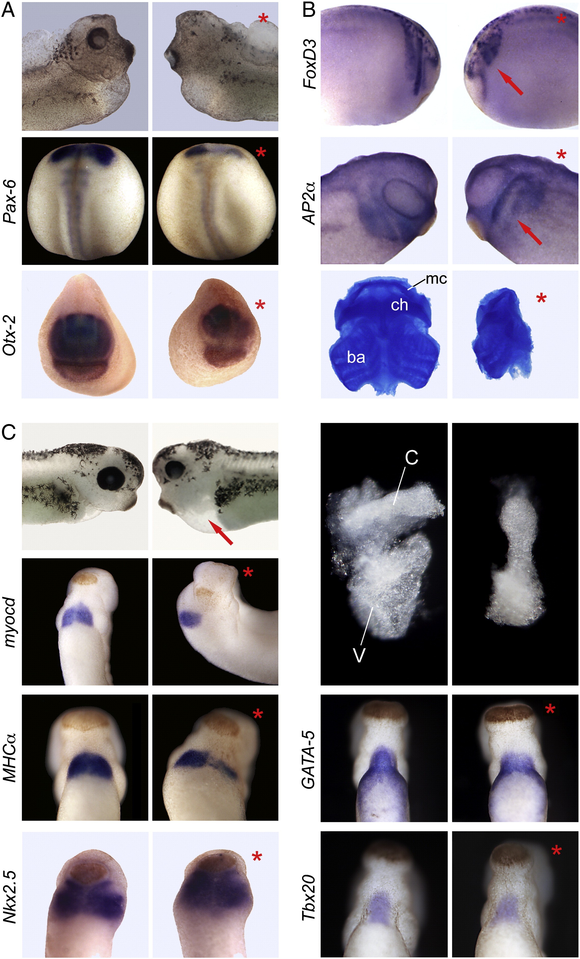 Fig. 6. FoxO4MO injection affects eye, heart and cranial crest development. (A) FoxO4 depletion results in lack of eye structures. Head of an unilaterally FoxO4MO injected embryo (40 ng/blastomere) at stage 39 (lateral view). The eye is almost absent. Middle: Pax-6 whole mount in situ hybridization of control and unilaterally FoxO4MO injected embryos at stage 21. Bottom: Otx-2 whole mount in situ hybridization of control and unilaterally FoxO4MO injected embryos at stage 25. (B) FoxO4 depletion affects cranial crest and jaw development. In situ hybridization of unilaterally FoxO4MO injected embryos with the neural crest markers FoxD3 at stage 23 and AP2α at stage 33. Red arrows indicate the lack of FoxD3 and AP2α expression. Bottom: Alcian blue stained control and unilaterally FoxO4MO injected embryo (30 ng/blastomere) at stage 47. (C) FoxO4 depletion results in failure of heart development. Top: lateral view on control and bilaterally FoxO4MO injected embryo at stage 41. Right: control heart of stage 43 embryo and heart of FoxO4MO injected embryo (20 ng/blastomere at 2-cell stage). Bottom: control- and unilaterally FoxO4Mo injected embryos. myocd and MHCα in situ hybridization reveals reduced expression at the injected side. In situ hybridization of unilaterally FoxO4MO injected embryos with Nkx2.5, GATA-5 and Tbx20. Red asterisks indicate the side of injection. ba, branchial arches; c, conus; ch, ceratohyale; mc, Meckel's cartilage; v, ventricle. Percentages of phenotypes are given in supplementary Table S7. |