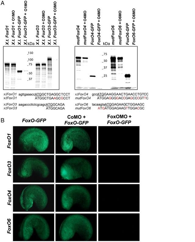 Fig. 5. Loss of FoxO function results in severe developmental defects. (A) Left column: Uninjected control embryo at stage 39, bilaterally CoMO injected embryo (50 ng/blastomere), mm-FoxO4MO injected embryo (40 ng/blastomere). Right column: FoxO1MO injected embryo (50 ng/blastomere), FoxO6MO injected embryo (30 ng/blastomere), FoxO4MO injected embryo (20 ng/blastomere). All embryos are shown by lateral view. (B) Real time RT-PCR for Sod-2 in wild type and FoxO depleted embryos at stages 18 and 24. FoxO1MO: 35 ng/blastomere, FoxO4MO: 15 ng/blastomere, FoxO6MO: 25 ng/blastomere. (C) FoxO3 depleted embryo and rescue (anterior view). Uninjected control embryo and bilaterally CoMO injected embryo (50 ng/blastomere) at stage 19. Injection of 20 ng FoxO3MO does not interfere with blastopore closure but leads to death during neurulation. Co-injection of 20 ng FoxO3MO together with 500 pg FoxO3 RNA of X. tropicalis can rescue to wild type. (D) Rescue of eye structures in FoxO4 depleted embryos. Magnification of the head at stage 35/36 (lateral view): uninjected control; CoMO injected embryo; FoxO4MO injected embryo, the eye is absent; rescue of the eye by co-injection of 160 pg mutated FoxO4-GR RNA. 15 ng CoMO or FoxO4MO were co-injected with fluorescein in one dorsal blastomere at 4-cell stage. Percentages of phenotypes are given in supplementary Table S4-S6. |