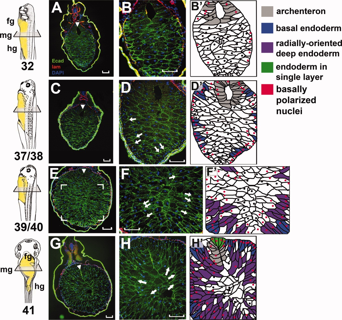 Figure 1. Changes in endoderm cell shape and polarity precede elongation in the Xenopus primitive gut tube. Tadpoles were sectioned and immunohistochemically stained to reveal cell membranes (E-cadherin, green), the basement membrane (laminin, red), and nuclei (DAPI [4 prime ,6-diamidine-2-phenylidole-dihydrochloride], blue). The plane of section is indicated in the yellow embryo diagrams (adapted from Nieuwkoop and Faber, [1994]), with stage 32-40 in lateral view and stage 41 in ventral view. Low magnification (00; A,C,E,G) and high magnification (00; B,D,F,H) views of each section are shown. Scale bar = 100 mu M. Brackets in E indicate the region shown in higher magnification in F. The position of the archenteron is indicated by white arrowheads. The color-coded legend refers to the diagrams in B prime , D prime , F prime , H prime that highlight representative endoderm cells with nuclei indicated by circles. A-B prime : Before gut tube elongation (stage 32), most of the endoderm cells are rounded and unpolarized. C-D prime : At stage 37/38, the most basal endoderm cells (arrows, D; blue cells in D prime ) adopt a radial orientation and a polarized morphology. E-F prime : At stage 39-40, deeper endoderm cells (arrows, F; purple cells in F prime ) become polarized and radially oriented. G-H prime : At stage 41, more central endoderm cells are polarized and radially oriented (arrows, H; purple cells in H prime ). fg, foregut; hg, hindgut; mg, midgut. |
