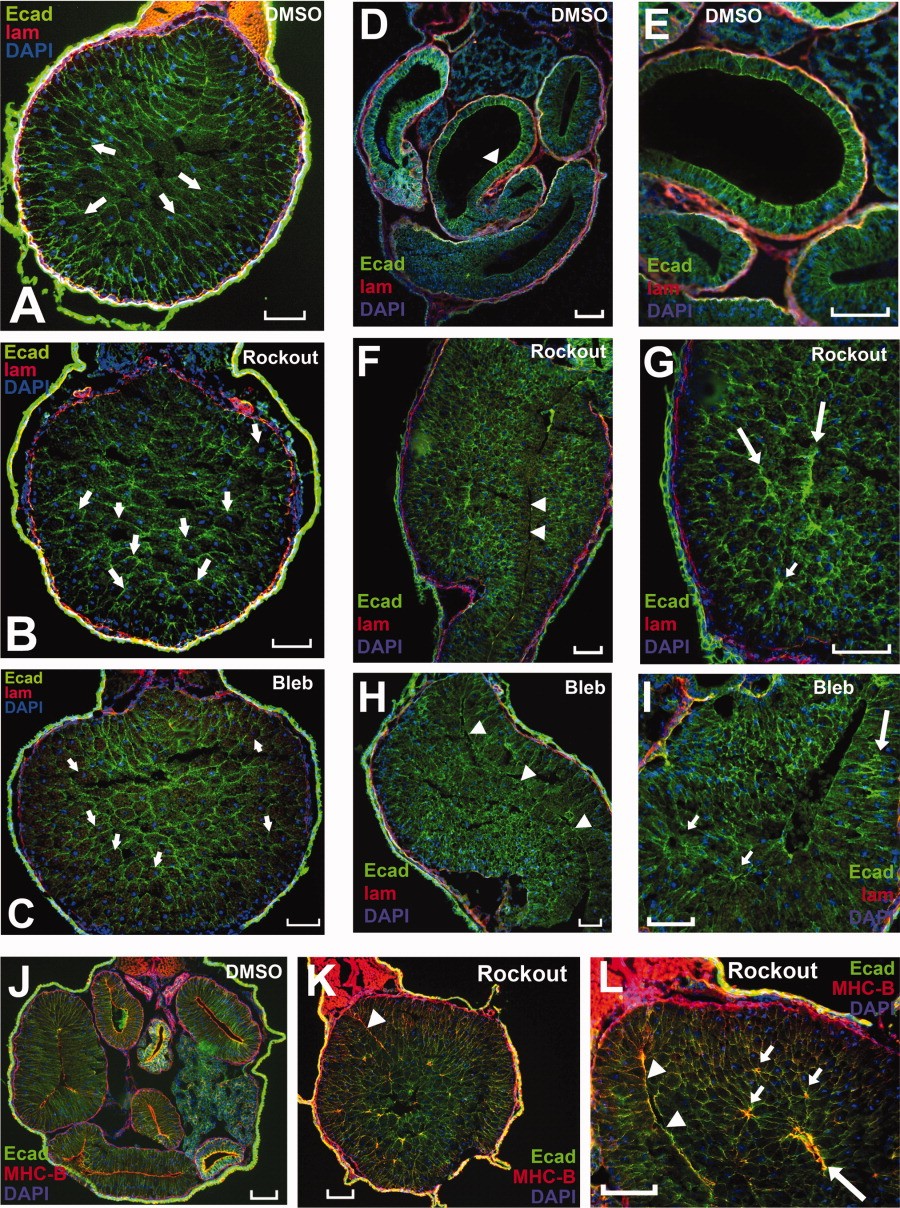 Figure 7. Rho-associated kinase and Myosin II are required for endoderm cell shape change, gut lumen formation and epithelial morphogenesis. Immunohistochemical staining for E-cadherin (Ecad, green) and laminin (lam, red) as shown in A-I, or E-cadherin (green) and Myosin heavy chain IIB (MHC-B, red) as shown in J-L, was performed on transverse (A-C; stage 41) or frontal (D-I; stage 46) sections through the midgut. Embryos were treated with dimethyl sulfoxide (DMSO; A,D,E,J), a Rho kinase inhibitor (Rockout; B,F,G,K,L), or a Myosin II inhibitor (Blebbistatin; C,H,I) from stage 32. The elongation, radial orientation, and polarization of the endoderm cells occurs normally in control, DMSO-treated embryos (arrows, A). However, in embryos exposed to Rockout or Blebbistatin, endoderm cells are more rounded and not polarized (arrows, B,C). At later stages, Rho kinase-deficient (F,G) or Myosin II-inhibited (H,I) embryos exhibit a thickened gut wall and disorganized epithelial tissue architecture in their shortened gut tubes. The gut lumen (arrowheads, D,F,H) does not expand when Rho kinase (F) or Myosin II (H) activity is inhibited. Moreover, accumulations of E-cadherin can be observed between the layers of unintercalated cells (long arrows, G,I), and centered among cells with abnormal polarity forming rosette-like clusters in the gut wall (short arrows, G,I). Finally, compared with control embryos (J), MHC-B colocalizes abnormally with E-cadherin in the disorganized epithelium of Rho kinase-deficient embryos (K,L). Scale bar = 100 mu M. |