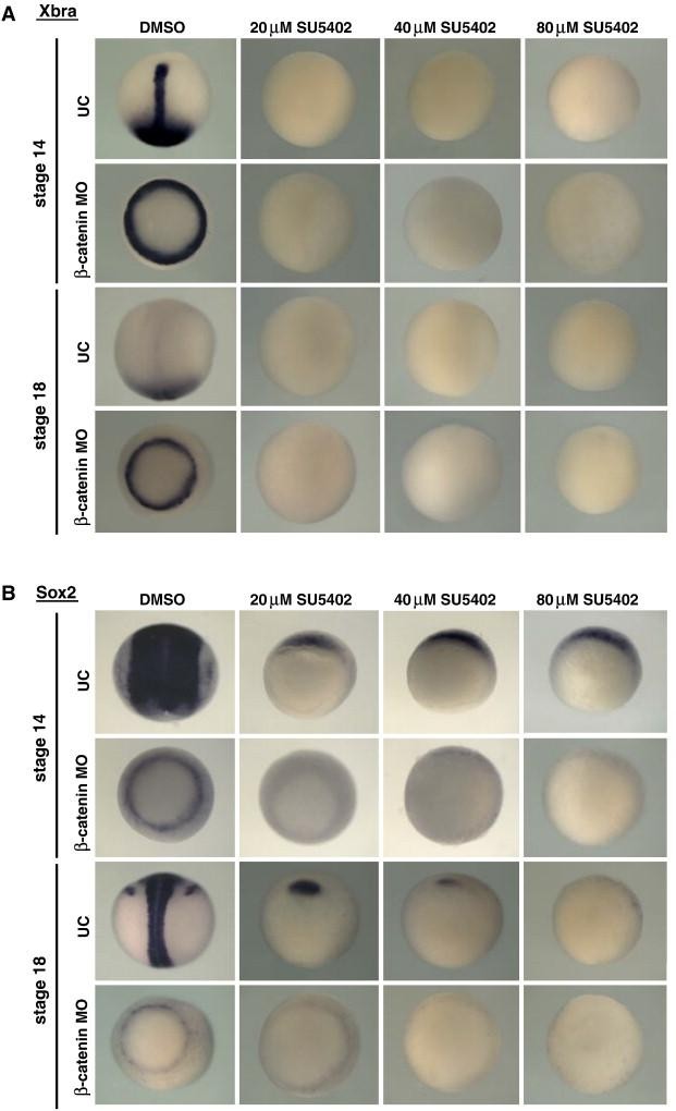 Fig. 3. The sox2 expressed in β-catenin morphants is FGF-dependent. X. laevis embryos were injected with β-catenin MO and cultured in SU5402 to the stage indicated, then fixed and assayed for expression of xbra (A) or sox2 (B). (A) Control uninjected DMSO-treated embryos express xbra in the notochord and posterior mesoderm at stage 14, and in the posterior mesoderm only at stage 18. This expression is lost in embryos treated with the Fgf receptor inhibitor SU5402. β-catenin morphants treated with DMSO express xbra in a ring around the blastopore at stages 14 and 18, and this expression is also lost with SU5402 treatment. (B) Expression of sox2 in uninjected embryos is reduced by SU5402 treatment, although small amounts of sox2 expression are retained anteriorly for all doses of SU5402 at stage 14, and for all but the highest doses of SU5402 at stage 18. In β-catenin embryos, sox2 is expressed in a ring around the blastopore, which is very sensitive to SU5402 and is lost even at low SU5402 doses both at stage 14 and 18. |