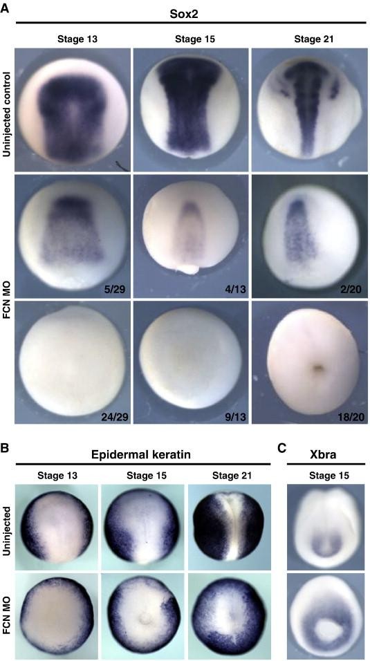 Fig. 4. X. laevis FCN morphants do not express sox2. X. laevis embryos were injected in each blastomere at the 2 cell stage with 20 ng each of follistatin, chordin, and noggin MOS. Embryos were raised to the stage indicated, fixed in MEMFA, and stained for expression of sox2 or epidermal cytokeratin. (A) Some embryos expressed low levels of sox2, but this expression was not seen in a ring. Most FCN morphants do not express sox2. The fraction of embryos falling into each class of sox2 expression are shown in the lower right corner. (B) Cytokeratin is expressed strongly in FCN morphants at all stages assayed, but is excluded from the blastopore and adjacent tissue (22/24 embryos with strong circumferential expression). (C) Xbra expression is expanded in neurula stage FCN morphants. Embryos are shown in dorsal views with anterior to the top. |