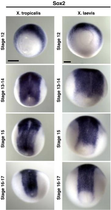 Fig. 5. sox2 has slightly different endogenous expression in X. tropicalis and X. laevis. X. tropicalis or X. laevis embryos were raised to the stage indicated, fixed in MEMFA and analyzed by in situ hybridization for expression of sox2. In X. tropicalis, sox2 expression closes posteriorly around the blastopore, and is tightly adjacent to the blastopore margin. In X. laevis, posterior circumblastoporal expression of sox2 is weak. All embryos are shown in dorsoposterior views with anterior to the top; the embryos have been rotated slightly to clearly show the blastopore. |