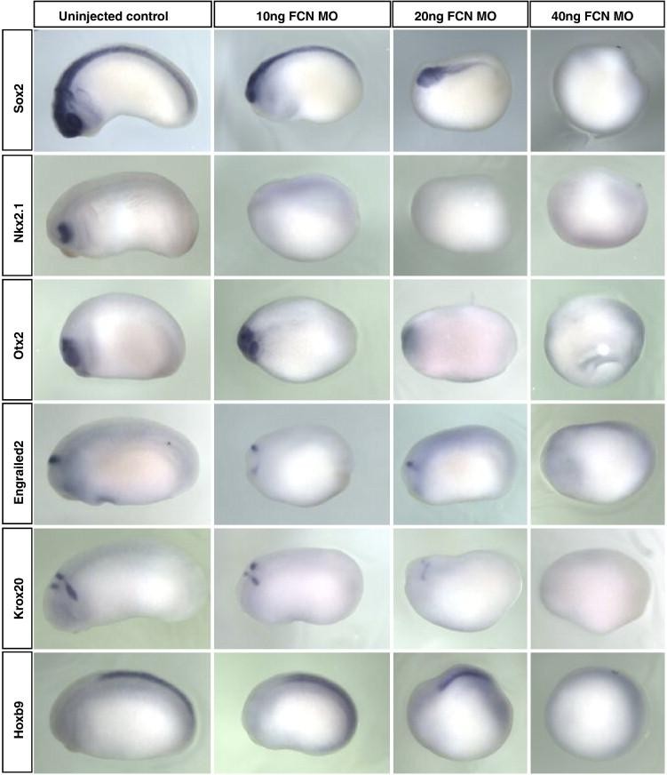 Fig. 6. Anterior neural markers are more sensitive to the loss of Bmp antagonists than posterior neural markers. X. laevis embryos were injected at the two-cell stage with increasing doses of Follisatin, Chordin, and Noggin MOs. Embryos were injected in both blastomeres at the two-cell stage; doses indicated refer to the total dose of MO injected into the embryo. Embryos were raised to stage 22, fixed and analyzed by in situ hybridization for expression of the genes indicated. nkx2.1 marks the ventral forebrain and is lost in embryos injected with low doses of FCN MOs. The forebrain/midbrain marker otx2, midbrain/hindbrain boundary marker en2 and rhombomeres 3/5 marker krox20 have reduced expression in embryos injected with low or intermediate doses of MO, and are lost in embryos injected with a high dose of MOs. The spinal cord marker hoxB9 is expressed strongly in embryos injected with low or intermediate doses of MO and is lost in embryos injected with a high dose of MO. Embryos are shown in lateral views with anterior to the left. |