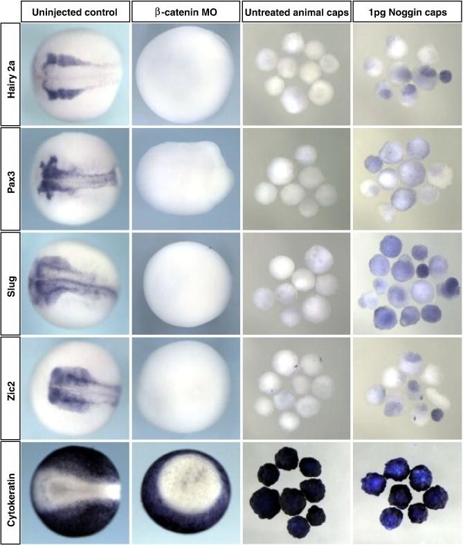 Fig. 7. Xenopus ectodermal explants and ventralized embryos do not express neural border markers. Uninjected control X. laevis embryos, β-catenin morphants, and animal caps cut from blastula stage uninjected or noggin-injected embryos were cultured to stage 20 and assayed for expression of the neural border markers pax3, hairy2a, and zic2, and the neural crest marker slug. Expression of these genes was not detected in animal caps or β-catenin morphants (of β-catenin morphants, 0% expressed hairy2a (n = 14), pax3 (n = 15), and zic2 (n = 14), while 6% expressed slug weakly (n = 16). All four genes had some expression in animal caps cut from embryos injected with 1 pg of noggin mRNA (63% for hairy2a, n = 8; 50% for pax3, n = 10; 79% for slug, n = 14; and 67% for zic2, n = 9) . The epidermal marker cytokeratin is strongly expressed in β-catenin morphants but excluded from the blastopore. Cytokeratin is strongly expressed in both injected and uninjected animal caps, but was somewhat weaker in noggin-injected animal caps. Embryos are shown in dorsal views with anterior to the left. |