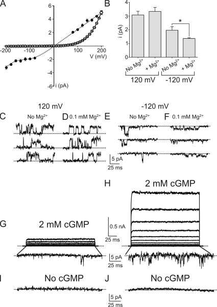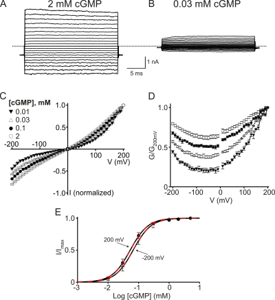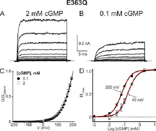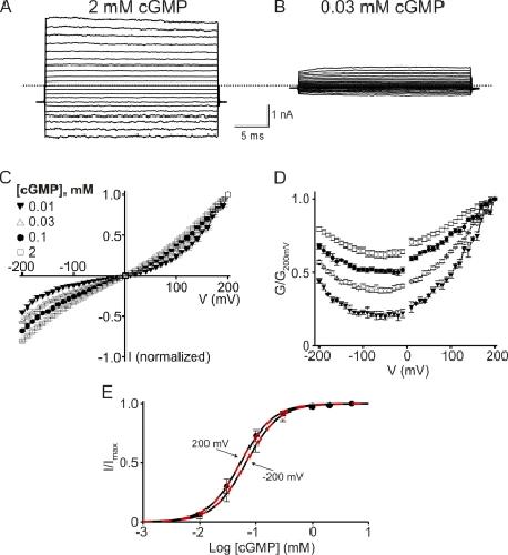 Nache, Gating of cyclic nucleotide-gated (CNGA1) channels by cGMP jumps and depolarizing voltage steps. 2006, Pubmed , Xenbase