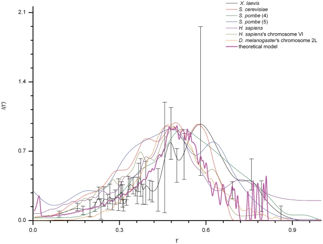 Figure 3. Collapse of all I(t').All curves were shifted horizontally so that their starting points coincide with zero. The similarity distance (dsim) between the I(t') of other eukaryotes and the I(t') of X. laevis (Black) was measured using the Continuous Dynamic Time Warping method (see Material and Methods). By using the X. laevis data dispersion (gray error bars) we set the condition that if the measured distance between two curves is smaller than 0.94, the two curves are similar. In all cases we found dsim<0.94, therefore all I(t'), including the one generated by the numerical model, could be considered as similar. However, its possible to define a sequence of decreasing similarity between considered I(t') as: H. sapiens ‘s chromosome 6 (dsim = 0.27, Dark yellow)>D. melanogaster (dsim = 0.38, Orange)>numerical model (dsim = 0.41, Magenta)>S. pombe from Heichinger et al (dsim = 0.43, Olive)>H. sapiens (dsim = 0.44, Purple)>S. pombe from Eshaghi et al (dsim = 0.55, Blue)>S. cerevisiae (dsim = 0.85, Red).