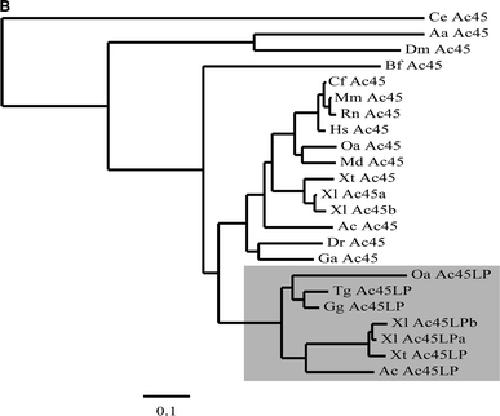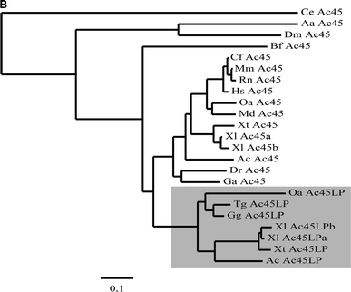 Fig. 2. The evolutionary history of the Ac45 and Ac45LP genes. a Schematic overview of genes surrounding the (presumptive) Ac45LP- and Ac45 genes. The Ac45LP gene was identified in chicken and Xenopus, but not in zebrafish. In human and mouse, only a remnant of the presumptive Ac45LP gene (exon 9) was found. The Ac45LP-neighboring genes were fully conserved. The Ac45 gene and its neighboring genes were fully conserved among species, with the exception of chicken. b Alignment of the partial human and mouse presumptive Ac45LP amino acid sequences (deduced from exon 9 Ac45LP sequences) with Ac45LP amino acid sequences from various species. Asterisk Stop codon preceding the exon 9 Ac45LP open reading frame. AcAnolis carolinensi, GgGallus gallus, HsHomo sapiens, TgTaeniopygia guttata, MmMus musculus, OaOrnithorhynchus anatinus, XlXenopus laevis, XtX.tropicalis. c Lineage-dependent evolutionary fate of the Ac45 and Ac45LP genes