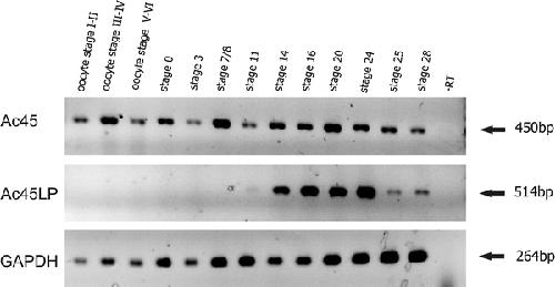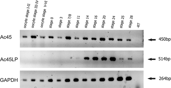Fig. 4. Expression of Ac45 and Ac45LP mRNAs in developing Xenopus. Total RNA was extracted from Xenopus embryos (developmental stages are indicated). Reverse transcriptase-PCR analysis was performed as described in the Materials and Methods. Glyceraldehyde 3-phosphate dehydrogenase (GAPDH) served as an internal control for RNA integrity. -RT Absence of reverse transcriptase (negative control). Staging of Xenopus embryos was according to Nieuwkoop and Faber [30]