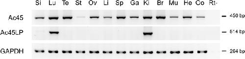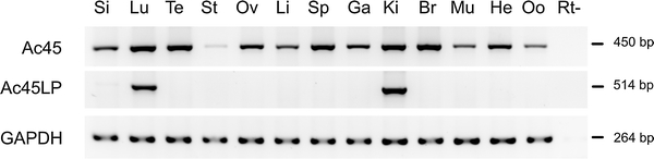 Fig. 7. Tissue distributions of Xenopus Ac45 and Ac45LP mRNAs. RNA was extracted from various tissues and RT-PCR analysis was performed as described in the Material and Methods. GAPDH served as an internal control for RNA integrity. Si Small intestine, Lu lung, Te testes, St stomach, Ov ovary, Li liver, Sp spleen, Ga gall bladder, Ki kidney, Br brain, Mu muscle, He heart, Oo oocytes, Rt absence of reverse transcriptase (negative control)
