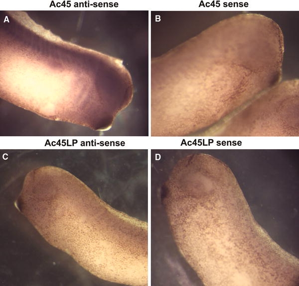 Fig. 5. Whole-mount in situ hybridization for Ac45 and Ac45LP mRNAs in stage-30 Xenopus embryos. Hybridizations with Ac45-anti-sense- (a) and Ac45-sense (b) DIG-labeled probes. Ac45 mRNA expression was predominantly found in developing neural tissues (brain, spinal cord and eye). c No signals were observed with the Ac45LP-anti-sense probe. d Negative control using the Ac45LP-sense probe
