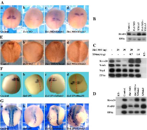 Fig. 4. Ectopic XMeis3 expression rescues the Zic protein knock down phenotypes. (A) One-cell stage embryos were separately injected in the animal hemisphere with 20 ng of Zic1 MO and/or 0.2 ng of XMeis3 RNA. At neurula stage 16, embryos were scored for neural fold inhibition and fixed. 71% of the Zic1 morphant embryos (n = 21) had severely inhibited neural fold closure. In the Zic1 MO/XMeis3 coinjected group, only 23% of the embryos (n = 40) had severely inhibited neural fold closure. Only those embryos with rescued neural folds were taken for Krox20 expression analysis. (a) In the control group, 6/6 embryos stained positive for Krox20 expression; (b) In the Zic1 MO group, 1/6 stained positively. (c, d) In the elongated embryos from the Zic1 MO/XMeis3 injected group, 5/7 stained positively. (B) One-cell stage embryos were separately injected in the animal hemisphere with 20 ng of Zic1 MO and/or 0.2 ng of XMeis3 RNA. Total RNA was isolated from pools of seven gastrula stage 11 embryos in each group. Semi-quantitative RT-PCR analysis was performed with the markers: HoxD1 and EF1-alpha. -RT-PCR was performed (not shown) on total RNA isolated from normal embryos. (C) One-cell stage embryos were separately injected in the animal hemisphere with 20 or 30 ng of Zic1 MO and/or 0.7 or 1.4 ng of XMeis3 RNA. Total RNA was isolated from pools of six to twelve neurula stage 16 embryos in each group. Semi-quantitative RT-PCR analysis was performed with the markers: Krox20, n-tubulin, Nrp1, and EF1-alpha. Nrp1 is a panneural marker. -RT-PCR was performed on total RNA isolated from normal embryos. (D) One-cell stage embryos were separately injected in the animal hemisphere with 45 ng of Zic1 MO and/or 0.9 ng of XMeis3 RNA. Total RNA was isolated from pools of six late neurula stage 20 embryos in each group. Semi-quantitative RT-PCR analysis was performed with the markers: Krox20, FoxD1, and EF1-alpha. -RT-PCR was performed on total RNA isolated from normal embryos. (E) One-cell stage embryos were separately injected in the animal hemisphere with 20 ng of Zic1 MO and/or 0.1â0.2 ng of XMeis3 RNA. (a) At neurula stage 16, embryos were scored for neural fold inhibition and fixed. (b) 89% of the Zic1 morphant embryos (n = 18) had extremely inhibited neural fold closure. (c, d) In the Zic1 MO/XMeis3 coinjected group, 58% of the embryos (n = 57) had fairly normal neural fold closure, versus 11% in the Zic1 morphant group (b). (F) Two-cell stage albino embryos were injected unilaterally into the animal hemisphere of one blastomere with 200 pg of Zic5 DN protein and/or 0.4 ng of HoxD1 or 0.5 ng of XMeis3 encoding RNA. Significant morphological rescue was also observed in the co-injected embryos. All embryos are oriented, right side/injected side, dorsal view, anterior (top), posterior (bottom). The dashed red lines mark the dorsal midline. (a) At neurula stage 17, embryos were scored for Krox20 expression. (b) Krox20 was expressed in only 7.5% of the Zic5 DN injected embryos. (c) Krox20 was expressed highly in 38% of the XMeis3/Zic5 DN co-injected embryos (n = 50). (d) Krox20 was expressed highly in 20% of the HoxD1/Zic5 DN co-injected embryos (n = 50). (G) One-cell stage embryos were separately injected in the animal hemisphere with 0.35 ng of Zic5 DN RNA and/or 0.3 ng of XMeis3 RNA. (a) At neurula stage 17, embryos were scored for n-tubulin expression (b). In the Zic5 DN injected group, 69% of the embryos had medium to undetectable levels of n-tubulin expression (n = 21). (c, d) In the Zic5 DN/XMeis3 injected group 79% of the embryos had medium to strong levels of n-tubulin expression (n = 24). In this same experiment, inhibition of Krox20 expression by the Zic5 DN protein was also rescued by ectopic XMeis3 protein levels (not shown). |