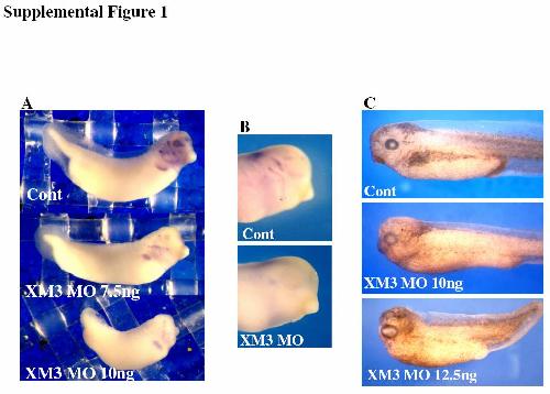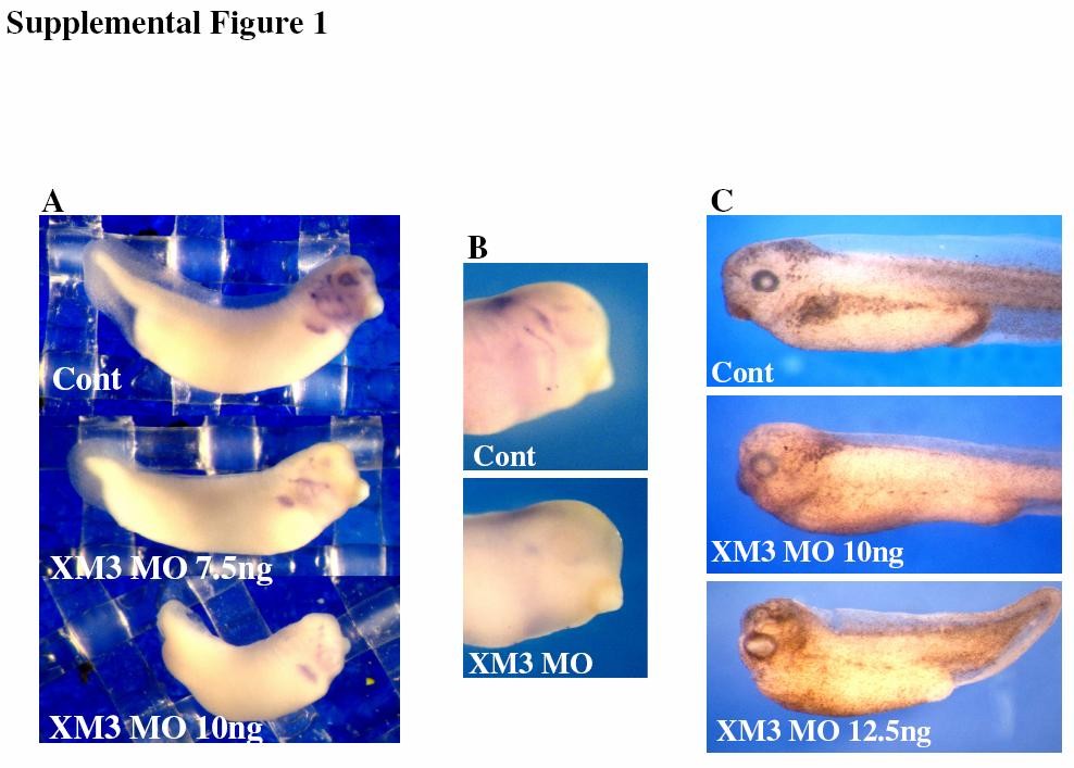Supplemental Figure 1. The XMeis3 MO inhibits neuron and neural crest cell fates in later tadpole stage embryos. A. Islet-1 (Xisl-1) expression is inhibited in XMeis3 morphant embryos in comparison to controls embryos (upper panel), 7.5 ng XMeis3 MO (center panel) or 10 ng XMeis3 MO (lower). Xisl-1 expression was highly inhibited in over 85% of the morphant embryos (n = 69). XMeis3 MO was injected at the one-cell stage. At tadpole stages, Xisl-1 marks a subset of cranial neurons (upper panel). Note that Xisl-1 expression in the heart region of morphant embryos is fairly normal despite the strong neural phenotype. B. Tanabin/nestin expression is inhibited in XMeis3 morphant embryos. At tadpole stages, tanabin/nestin is a marker for cranial nerve cells (upper panel). Expression is ablated in morphant embryos (lower panel). C. Melanocytes are lost in XMeis3 morphant embryos. Compare controls embryos (left panel), to morphants, 10 ng XMeis3 MO (center panel) or 12.5 ng XMeis3 MO (right panel). Melanocyte formation was highly inhibited in over 90% of the morphant embryos (n = 50). XMeis3 MO was injected into one blastomere at the two-cell stage. |