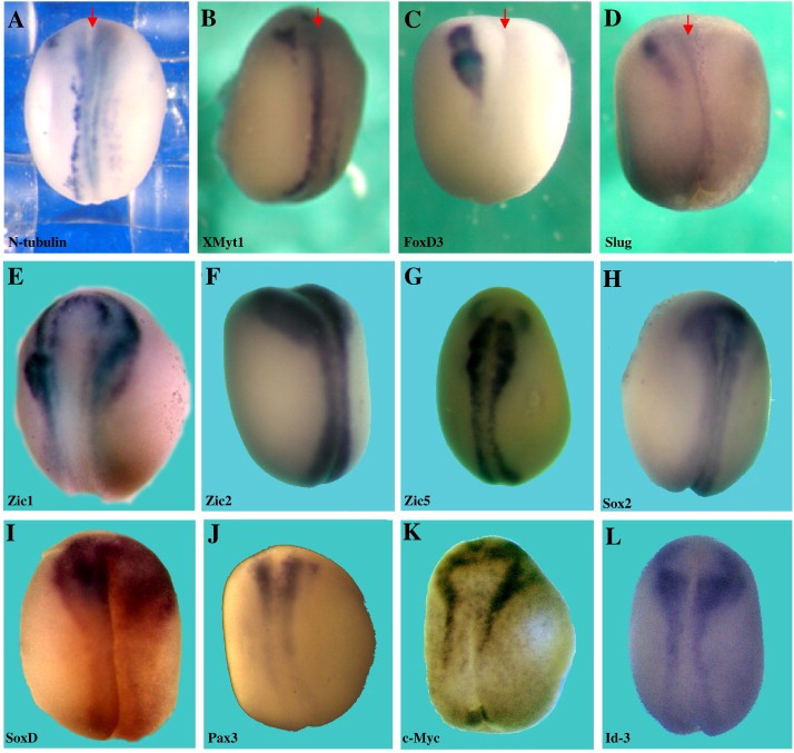 Fig. 1. XMeis3 knockdown inhibits primary neuron and neural crest marker expression, but does not inhibit expression levels of Sox and Zic family genes or upstream regulators of neural crest. Two-cell stage albino embryos were injected unilaterally into the animal hemisphere of one blastomere with 10â20 ng of XMeis3 MO. All embryos are injected on the right side, viewed dorsally and are oriented anterior (top), posterior (bottom); the red arrows mark the dorsal midline in AâD. (A) N-tubulin expression is inhibited in 91% of the embryos (n = 100/110). (B) XMyt1 expression is inhibited in 100% of the embryos (n = 12/12). (C) FoxD3 expression is inhibited in 83% of the embryos (n = 116/139). (D) Slug expression is inhibited in 75% of the embryos (n = 70/93). (E) Zic1 expression is normal in 96% of the embryos (n = 26/27). (F) Zic2 expression is normal in 96% of the embryos (n = 23/24). (G) Zic5 expression is normal in 91% of the embryos (n = 91/100). (H) Sox2 expression is normal in 95% of the embryos (n = 20/21). (I) SoxD expression is normal in 96% of the embryos (n = 26/27).(J) Pax3 expression is normal in 85% of the embryos (n = 28/33). 15% of the embryos had minor expression reductions. (K) c-Myc expression is normal in 83% of the embryos (n = 25/30). 17% of the embryos had minor expression reductions. (L) Id3 expression is normal in 84% of the embryos (n = 32/38). 16% of the embryos had minor expression reductions. In all experiments, Krox20 expression inhibition is assayed as a positive control for XMeis3 MO activity. In the described experiments, Krox20 expression is inhibited in 94% of the embryos (n = 190/202). Expression of the proneural gene (not shown), Xngnr1 is inhibited in 77% of the embryos (n = 48/62). For Sox, Zic, Pax3, c-Myc and Id3, overall gene expression levels are quite normal despite morphological perturbations on the XMeis3 MO injected side. |