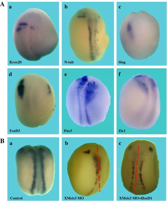 Fig. 2. Ectopic expression of the HoxD1 antimorph protein knockdown inhibits primary neuron and neural crest markers in addition to hindbrain markers. (A) Two-cell stage albino embryos were injected unilaterally into the animal hemisphere of one blastomere with 100 pg of RNA encoding the HoxD1 antimorph protein. All embryos are injected on the right side, viewed dorsally and are oriented anterior (top), posterior (bottom). (a) Krox20 expression is inhibited in 87% of the embryos (n = 83/95). (b) N-tubulin expression is inhibited in 97% of the embryos (n = 57/59). (c) Slug expression is inhibited in 85% of the embryos (n = 44/52). (d) FoxD3 expression is inhibited in 87% of the embryos (n = 52/60). (e) Pax3 expression is normal in 100% of the embryos (n = 16/16). (f) Zic1 expression is normal in 93% of the embryos (n = 13/14). XMeis3 expression (not shown) is normal in 100% of the embryos (n = 16/16). (B) Ectopic HoxD1 expression rescues n-tubulin expression in XMeis3 morphant embryos. The dashed red lines mark the dorsal midline. (a) Uninjected control embryo. (b) 18 ng XMeis3 MO, n-tubulin expression (right side) was inhibited in 68% (n = 22) of the embryos. (c) 18 ng XMeis3 MO, 0.8 ng HoxD1 RNA, n-tubulin expression was highly rescued (left side) in 75% (n = 12) of the embryos. |