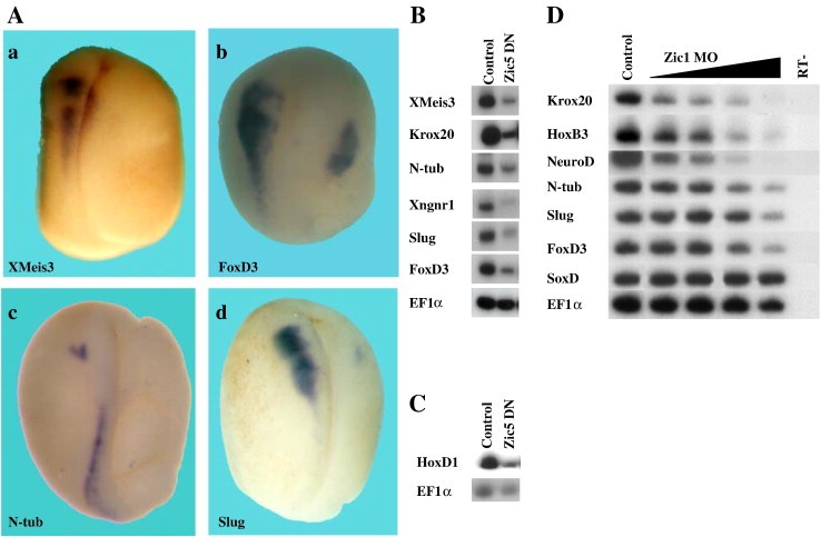 Fig. 3. Inhibition of Zic protein activity by ectopic expression of the Zic5 dominant-negative (DN) protein or the Zic1 MO inhibits hindbrain, primary neuron, and neural crest marker expression. (A) Two-cell stage albino embryos were injected unilaterally into the animal hemisphere of one blastomere with 200 pg of Zic5 DN protein encoding RNA. All embryos are injected on the right side, viewed dorsally and are oriented anterior (top), posterior (bottom). (a) XMeis3 expression is inhibited in 84% of the embryos (n = 42/50). (b) FoxD3 expression is inhibited in 91% of the embryos (n = 74/81). (c) N-tubulin expression is inhibited in 83% of the embryos (n = 91/109). (d) Slug expression is inhibited in 86% of the embryos (n = 37/43). (B) One-cell stage embryos were injected in the animal hemisphere with 0.4 ng of Zic5 dominant-negative protein encoding RNA. Total RNA was isolated from pools of seven neurula stage 16 embryos in each group. Semi-quantitative RT-PCR analysis was performed with the markers: XMeis3, Krox20, n-tubulin, Xngnr1, Slug, FoxD3, and EF1α. In all shown experiments, EF1-alpha serves as a control for quantitating RNA levels in the different samples. RT-PCR was performed on total RNA isolated from normal embryos (not shown in this experiment). (C) One-cell stage embryos were injected in the animal hemisphere with 0.4 ng of Zic5 dominant-negative protein encoding RNA. Total RNA was isolated from pools of eight gastrula stage 11.5 embryos in each group. Semi-quantitative RT-PCR analysis was performed with the markers: HoxD1 and EF1α. -RT-PCR was performed on total RNA isolated from normal embryos (not shown in this experiment). (D) One-cell stage embryos were injected in the animal hemisphere with 25, 30, 35, or 40 ng of Zic1 MO. RNA was isolated from pools of ten neurula stage 18 embryos in each group. Semi-quantitative RT-PCR analysis was performed with the markers: Krox20, HoxB3, NeuroD, n-tubulin, Slug, FoxD3, SoxD, and EF1α. -RT-PCR was performed on total RNA isolated from normal embryos. |