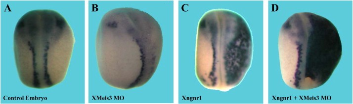 Fig. 7. Ectopic Xngnr1 expression rescues n-tubulin expression in XMeis3 morphant embryos. Two-cell stage albino embryos were co-injected unilaterally into the animal hemisphere of one blastomere with 10â20 ng of XMeis3 MO and/or 0.8 ng of RNA encoding the Xngnr1 protein. All embryos are injected on the right side, viewed dorsally and are oriented anterior (top), posterior (bottom). Whole mount in situ hybridization of the n-tub marker is shown. A. N-tubulin expression is normal in 100% of the uninjected control embryos (n = 22/22). B. N-tubulin expression is highly inhibited in 92% of the XMeis3 morphant embryos (n = 11/12). As a control for XMeis3 MO activity, Krox20 expression was examined (not shown); its expression was inhibited in 90% of the embryos (n = 9/10). (C) Injection of Xngnr1 RNA induces ectopic n-tubulin expression in 87% of the control embryos (n = 20/23). (D) Injection of Xngnr1 RNA induces high ectopic n-tubulin expression levels in 100% of the XMeis3 morphant embryos (n = 18/18). Krox20 was not ectopically activated in these embryos (not shown). |