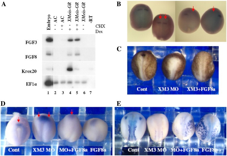 Fig. 8. FGF3/8 genes lie downstream to XMeis3 protein. (A) FGF3 and FGF8 are XMeis3 direct-target genes. One-cell stage embryos were injected in the animal hemisphere with 250 pg of inducible XMeis3-GR encoding RNA. In all experimental groups, eighteen animal cap explants were respectively removed from embryos at blastula stages 8â9. Explants from each group were grown in cyclohexamide and/or dexamethasone (materials and methods) to stage 12 and total RNA was isolated. RT-PCR analysis was performed with the markers: Krox20, FGF3, FGF8 and EF1α. For controls, RT-PCR and -RT-PCR was performed on total RNA isolated from five normal embryos. (B) XMeis3 knockdown inhibits FGF3 expression. Two-cell stage embryos were injected unilaterally into the animal hemisphere of one blastomere with 7â10 ng of XMeis3 MO. All embryos are viewed dorsally and are oriented anterior (top), posterior (bottom). As designated by the red arrows, in comparison to control embryos (left panel) FGF3 expression in the hindbrain is inhibited on the injected side of the shown embryos (right panel). FGF3 expression was inhibited in 77% of the XMeis3 morphant embryos (n = 177). (C) Ectopic FGF8a expression rescues neural folding and convergent extension in XMeis3 morphant embryos. One-cell stage embryos were injected unilaterally into the animal hemisphere of one blastomere with 19 ng of XMeis3 MO followed by injection of 15 pg of a CMV-vector driving zygotic FGF8a expression. Embryos were cultured until stage 18, and fixed for analysis. All embryos are viewed dorsally and are oriented anterior (top), posterior (bottom). Left panel: uninjected control, center panel: XMeis3 morphant, a shorter embryo with poor neural folding, right panel: XMeis3 MO + FGF8a, the embryo is longer with more distinct neural folds. (D) One-cell stage embryos were separately injected in the animal hemisphere with 15 ng of XMeis3 MO and/or 15â30 pg of FGF8a encoding DNA vector. At neurula stage 16, embryos were fixed and examined for expression of the anterior neural marker. The red arrows emphasize the XANF-1 expression region. 82% of the morphant embryos (n = 28) had expanded XANF-1 expression. In the XMeis3MO/FGF8a coinjected group, only 20% of the embryos (n = 44) had expanded XANF-1 expression, whereas most embryos had fairly normal expression levels. (E) One-cell stage embryos were separately injected in the animal hemisphere with 18 ng of XMeis3 MO and/or 20â30 pg of FGF8a encoding DNA vector. At neurula stage 17, embryos were fixed and examined for expression of the n-tubulin marker. 96% of the morphant embryos (n = 26) had highly reduced n-tubulin expression. In the XMeis3MO/FGF8a coinjected group, 93% of the embryos (n = 55) had rescued-ectopic levels of n-tubulin expression, similar to embryos injected with the FGF8a vector alone. |