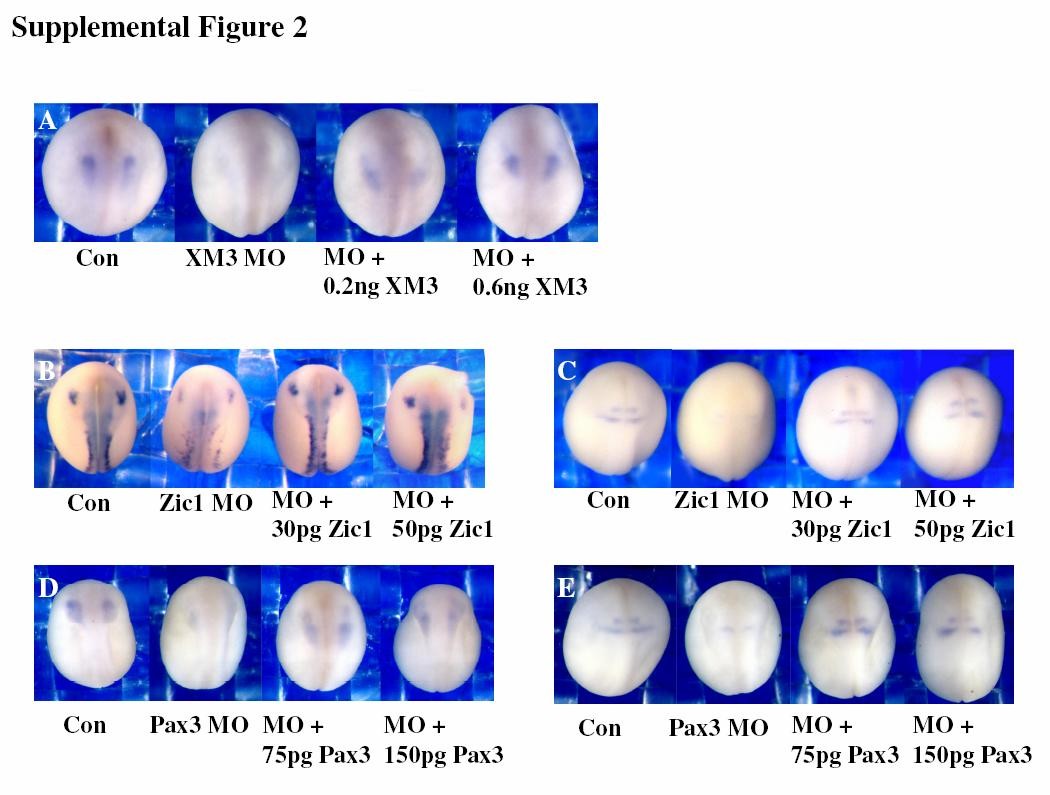 Supplemental Figure 2. mRNA rescue of morphant phenotypes. A. Ectopic expression of XMeis3 mRNA rescues FoxD3 expression in XMeis3 morphant embryos. Injection of the XMeis3 MO (23 ng) strongly inhibited FoxD3 expression in 74% of the morphant embryos (n = 27). In embryos co-injected with 0.2.6 ng of XMeis3 RNA, expression was expressed at fairly high levels in 97% of the embryos (n = 34). In additional experiments, as determined RT-PCR detection, n-tubulin and Krox20 expression was also rescued in morphant embryos. B. Ectopic expression of Zic1 mRNA rescues n-tubulin and Krox20 expression in Zic1 morphant embryos. Injection of the Zic1 MO (15 ng) inhibited n-tubulin expression in 68% of the morphant embryos (n = 19) and Krox20 in 72% of the embryos (n = 18). In embryos co-injected with 300 pg of Zic1 RNA, n-tubulin and Krox20 expression was expressed at high levels in over 70% of the embryos (n = 27 for each group). C. Ectopic expression of Pax3 mRNA rescues FoxD3 and Krox20 expression in Pax3 morphant embryos. Injection of the Pax3 MO (33 ng) inhibited FoxD3 expression in 56% of the morphant embryos (n = 9) and Krox20 in 71% of the embryos (n = 7). In embryos co-injected with 7550 pg of Pax3 RNA, FoxD3 was expressed at high levels in over 75% of the embryos (n = 17) and Krox20 was expressed at high levels in over 55% of the embryos (n = 18). |