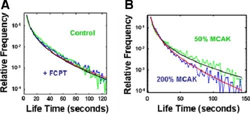 Figure 4. (A)Tubulin lifetimes are the same in unperturbed spindles (control, green symbols) and when microtubule translocation is blocked with FCPT (+FCPT, blue symbols). Best fits to Equation 1 are displayed without FCPT (black line, τ = 64 ± 6 s) and with FCPT (red line, τ = 71 ± 3 s). (B) Increasing concentration of MCAK, a microtubule depolymerizer, results in decreasing tubulin lifetimes. Spindles were assembled in extract with MCAK reduced to 50% native levels (green symbols and black line best fit to Equation 1, τ = 97 ± 11 s) or 200% native levels (blue symbols and red best fit, τ = 47 ± 8 s).