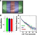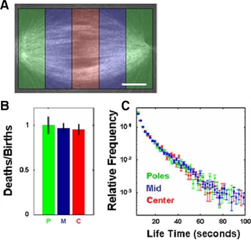 Figure 5. (A) Spindles were divided into fifths; two pole regions (green), two midregions (blue), and one central region (red). Bar, 10 μm. (B) Ratio of particle deaths to births is nearly equal to one in all regions. (C) Distributions of tubulin lifetimes in each region are the same.
