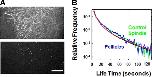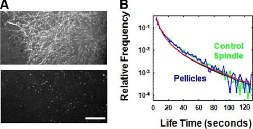 Figure 6. (A) Microtubules growing off of pellicles in X. laevis egg extracts. (A, top) Heavy labeling with Alexa-488 tubulin allows all microtubules to be visualized, but individual filaments cannot be resolved. (A, bottom) The same region as in A with single molecule level Alexa-647 tubulin. Bar, 10 μm. (B) Distributions of tubulin lifetimes from pellicles (pellicles, blue) and unperturbed spindles (control spindles, green) are very similar. Best fits to Equation 1 are displayed for pellicles (red, τ = 71 ± 9 s) and spindles (black, τ = 64 ± 6 s).