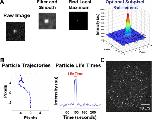 Figure 1. (A) Raw images were filtered and smoothed, and local maxima above a threshold brightness were selected as candidate particles (Crocker and Grier, 1996). For tracking displacements, the subpixel location of molecules were determined by fitting the intensity around each particle to a two-dimensional Gaussian, but the pixel location of particles was sufficient for the measurement of tubulin lifetimes and subpixel refinement was not used in that analysis. (B, left) Particle locations were linked to form trajectories by a global optimization procedure (Crocker and Grier, 1996). (B, right) Individual particles appeared and disappeared in a step-like manner. A particle's lifetime is defined as the difference between the times of disappearance and appearance. (C) Raw image of a spindle with single molecule level labeling.
