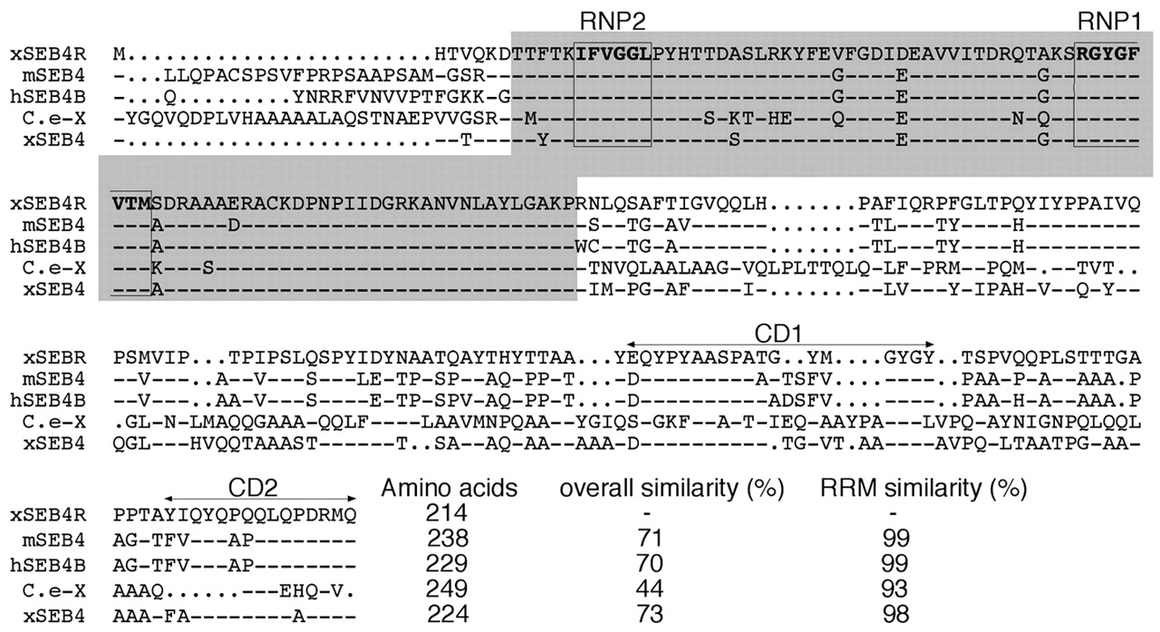 XSEB4R is an RRM-type protein. Alignment of XSEB4R (Accession Number AY289193) with its homologues in mouse (mSEB4, Accession Number NP062420), human (hSEB4B, Accession Number CAA53064) and C. elegans (C. e-X, Accession Number T33034), and with the Xenopus muscle specific XSEB4 protein (Accession Number AF223427). Dashes represent identical amino acids; dots represent gaps. The RNA recognition motif (RRM) is shaded in grey and the characteristic RNP consensus motifs (RNP1 and RNP2) are boxed. Two additional conserved domains (CD1 and CD2) are indicated. Sequence comparison is indicated as percentage (%) of amino acid similarity. |