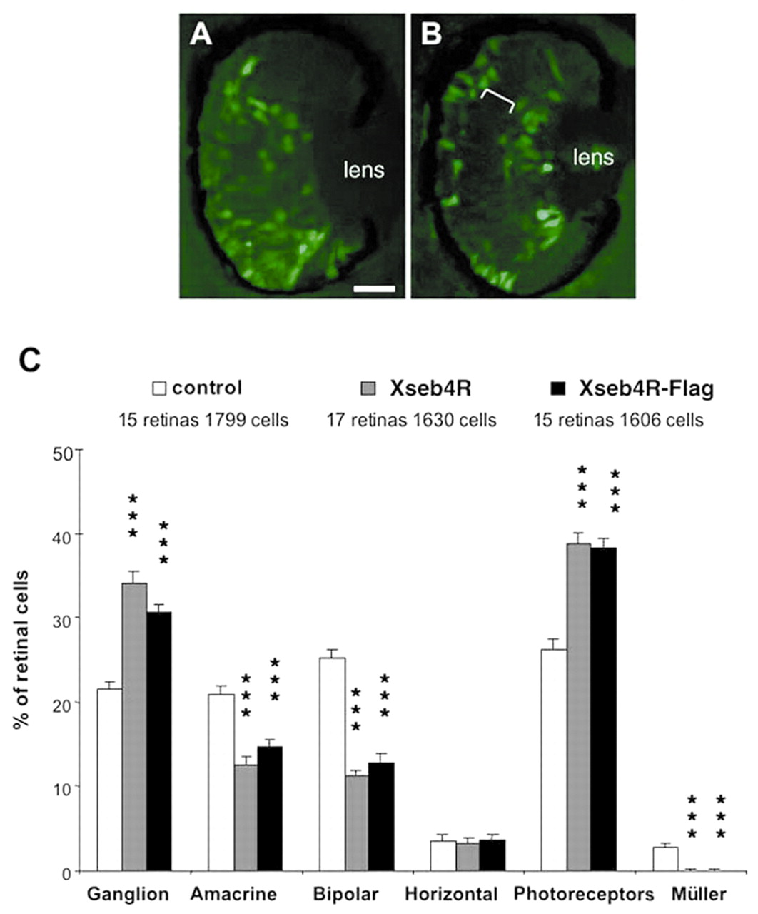 Xseb4R overexpression promotes early differentiation of retinal cells. (A,B) Typical sections of retinas co-transfected with GFP plus a control plasmid pCS2 (A), or GFP plus Xseb4R (B). The white bracket in B indicates the inner nuclear layer, where very few Xseb4R transfected cells are present compared with the control. (C) Percentage of retinal cell types observed in retinas co-lipofected with GFP plus pCS2, GFP plus Xseb4R, or GFP plus Xseb4R-flag. Statistical analysis was performed using the Student's t-test. ***, P<0.0001. Scale bar in A: 50 μm. |