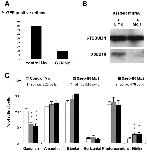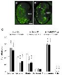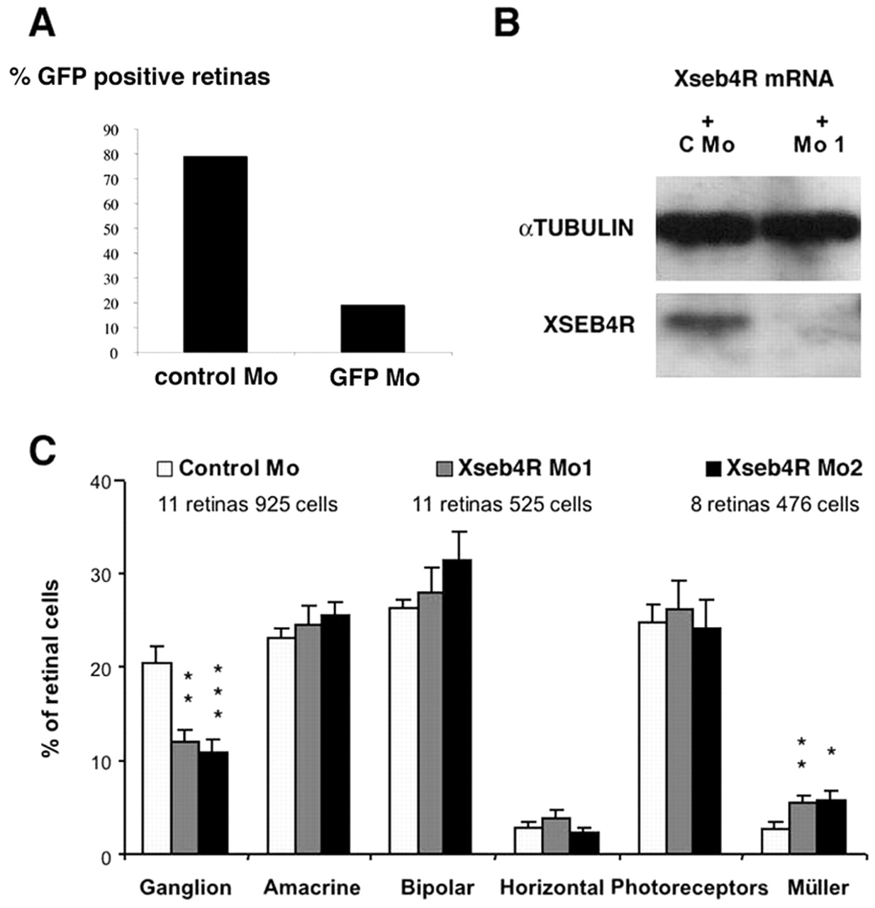 Morpholino oligonucleotides lipofection in the retina. (A) Retinal lipofection of GFP Mo interferes with GFP translation. Embryos were lipofected at stage 18 with GFP and a control Mo plus CD2, or with GFP and GFP Mo plus CD2. In stage 41 embryos, the intensity of GFP fluorescence in retinal cells was analysed. We used a filter to decrease the fluorescence light of the microscope so that low GFP fluorescent cells are below the detectable threshold. We then counted the number of lipofected retinas (CD2 positive) that also contain GFP-positive cells. While 79% (n=43 retinas) of CD2-positive retinas also contained GFP-positive cells when lipofected with a control Mo, only 19% (n=42 retinas) contained GFP-positive cells when lipofected with GFP Mo. (B) Xseb4R Mo block the translation of Xseb4R mRNA. Synthetic Xseb4R mRNA (containing the complementary sequence of Mo1) was injected into two-cell stage embryos together with Xseb4R Mo1 or control Mo. Stage 10 embryo lysates were then analysed by western blotting with a polyclonal anti-XSEB4R antibody and a monoclonal anti-αtubulin antibody (control). In the presence of control Mo, the anti-XSEB4R antibody recognises the 22 kD XSEB4 protein. The presence of Xseb4R Mo1 specifically abolishes Xseb4R translation. (C) Xseb4R loss-of-function delays differentiation of retinal cells. The proportion of retinal cell types observed in retinas co-lipofected with GFP plus a control Mo, GFP plus Xseb4R Mo1, or GFP plus Xseb4R Mo2 was determined. Both Mo give the same results. The statistical analysis was performed using the Student's t-test. *, P<0.05; **, P<0.001; ***, P<0.0001. |