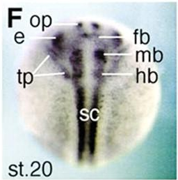 Fig. 2. XSeb4R is strongly expressed in the developing central nervous system. (A) Embryo (stage 10.5) presented in a posterior view, with dorsal up, shows a ring-like expression around the blastopore. (B) Transverse section (as indicated in A) showing Xseb4R in the mesoderm (me). (C) Embryo (stage 14) presented dorsally, with anterior up, revealing three bilateral stripes, medial (m), intermediate (i) and lateral (l), of Xseb4R expression in the open neural plate, as well as expression in the trigeminal placode (tp) and in the presumptive ventral midbrain/forebrain (vmfb) area. (D) Transverse section (as indicated in C) showing Xseb4R signals in both the sensorial layer (sl) of the neuro-ectoderm and in the mesoderm (me) as well as the notochord (no). (E,F) Embryos (stage 17 and 20, respectively) presented dorsally, with anterior up, showing additional Xseb4R expression in the olfactory placode (op), eye (e), forebrain (fb), midbrain (mb), hindbrain (hb) and spinal cord (sc). (G,H) Embryos (stage 24 and 32, respectively) placed laterally with anterior left showing Xseb4R expression in the tail bud (tb) and tail tip (tt). (I) Transverse section (as indicated in H) showing Xseb4R signal in the subventricular zone (svz) of the neural tube. (J) Lateral view showing a weak expression of Xseb4R expression in the developing pronephros (pn). (K) Two bilateral stripes of Xseb4R expression in cells associated with blood islands (bi), and a strong signal in the liver (li). (L) Expression during the characteristic Y-shape formation of blood islands. (M) Xseb4R-expressing cells in the area associated with duodenum (du) formation. (N,O) Embryos presented in the ventral view showing pigmented eye (pe) and Xseb4R expression in the presumptive rectum/anus (r/a). |