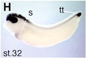rbm38 (RNA binding motif protein 38) gene expression in Xenopus laevis embryo, assayed via in situ hybridization, NF stage 32, lateral view, dorsal up, anterior left.