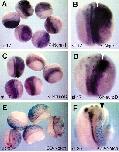 rbm38 ( RNA binding motif protein 38) gene expression in Xenopus laevis embryo, assayed via in situ hybridization, NF stage 13, lateral view, dorsal up, anterior left.