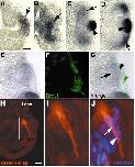 Fig. 3. In the retina, Xseb4R is expressed in retinoblasts and undifferentiated postmitotic neurons. (A-D) In situ hybridisation showing the spatio-temporal expression pattern of Xseb4R on retinal sections at various developmental stages. (A) At stage 28, Xseb4R is expressed in the whole presumptive neural retina that contains dividing retinoblasts (arrow). (B) At stage 32, Xseb4R is expressed in the whole neural retina containing mainly dividing precursor cells (arrow). (C) At stage 34, Xseb4R is most strongly expressed in the lens (arrowhead) and in the peripheral region of the neural retina containing dividing precursors (arrow). (D) At stage 37, Xseb4R expression is restricted to the CMZ (arrow) and the lens (arrowhead). (E-G) Staining for BrdU uptake (green; F) and Xseb4R expression (blue; E) at stage 39. Double staining (G) shows that BrdU-positive cells in the peripheral CMZ are Xseb4R negative (green arrowhead). In the central CMZ, BrdU-positive cells also express Xseb4R (black arrowhead). Some cells are BrdU negative and stained with Xseb4R (arrow). Scale bar in A: 50 μm. (H-J) Retinoblasts of stage 34 embryos were transfected at stage 18 with Xseb4R-Flag DNA. On sections, immunostaining was performed with an anti-FLAG antibody revealing the presence of XSEB4R-FLAG (red; H). (I) Higher magnification of this retinoblast. Hoescht staining was performed to visualise the nucleus. (J) Double staining showing that XSEB4R-FLAG is mainly cytoplasmic. The nucleus (arrow) and cytoplasm (arrowhead) are indicated. Scale bar in H: 30 μm. |