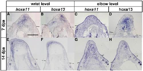 Fig. 3. hoxa11 and hoxa13 expressions in froglet blastemas. Blastemas were derived from amputation at the wrist level (A, B, E and F) or at the elbow level (C, D, G and H). (A, C) hoxa11 expression in 7 days post amputation (dpa) blastema. (B, D) hoxa13 expression in 7 dpa blastema. (E, G) hoxa11 expression in 14 dpa blastema. (F, H) hoxa13 expression in 14 dpa blastema. Note that hoxa11 and hoxa13 were reexpressed in the froglet blastema, but expression domains were never separated. Lines indicate the estimated amputation planes. Distal is to the top in all figures. Scale bar = 400 μm.