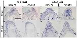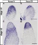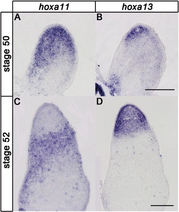 Fig. 1. hoxa11 and hoxa13 expressions in tadpolelimb buds. (A) hoxa11 expression in a stage 50 limb bud. hoxa11 expression was observed broadly in the distal half of limb bud mesenchyme. (B) hoxa13 expression in a stage 50 limb bud. Its expression was observed in the distal region. (C) hoxa11 expression in a stage 52 limb bud. hoxa11 was expressed in the presumptive zeugopod region. (D) hoxa13 expression in a stage 52 limb bud. hoxa13 was expressed in the presumptive autopod region. Distal is to the top in all figures. Scale bar = 400 μm.