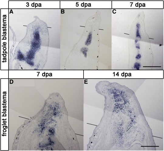 Fig. 4. Expression of cartilage maker gene, sox9, in tadpole and froglet blastemas. Limbs were amputated at the ankle level of tadpolehindlimb bud (AâC) or at the wrist level of froglet forelimb (D, E). (A) Expression in tadpole 3 days post amputation (dpa) blastema. Expression was observed in the proximal to amputation plane but not in the blastema. (B) Expression in tadpole 5 dpa blastema. Expression was observed in the proximal to amputation plane but not in the blastema. (C) Expression in tadpole 7 dpa blastema. Expression was observed distal and proximal to the amputation plane. (D) Expression in froglet 7 dpa blastema. Expression was observed in the blastema. (E) Expression in froglet 14 dpa blastema. Expression was observed in a broad region of the blastema. Lines indicate the estimated amputation planes. Distal is to the top in all figures. Scale bar = 400 μm.