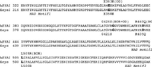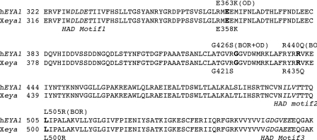 Figure 1. Comparison of the partial amino acid sequence of human and Xenopus eya1Amino acid substitutions associated with BOR and ocular defects are in larger boldface font. Italic letters indicate conserved motifs characteristic of HAD family proteins. (This Figure is modified from Rayapureddi and Hegde, 2006.) Mutation designations for human (hEYA1) as cited in the Human Gene Mutation Database (http://www.hgmd.cf.ac.uk/ac/index.php) are above the aligned sequences, and the corresponding numbering for Xenopus (Xeya1) is below them. OD, ocular defects. |