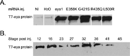 Figure 2. Expression of eya1 after injection of mRNA encoding eya1 proteins into Xenopus embryosEmbryos were injected (inj.) with 250 ng of mRNA, and protein isolated from two embryos was loaded on to each lane. (A) A Western blot that shows that mRNAs encoding eya1 and four mutant variants produce detectable protein in stage 12 embryos. Anti-T7 antibody was used to detect proteins. (B) A Western blot that shows that eya1 protein made from injected mRNA persists through stage 41. Anti-T7 antibody was used to detect proteins. NI, non-injected control. |