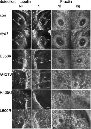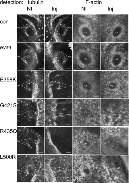Figure 5. Stage 32 otic development is disrupted by eya1 mutants linked to BORStage 32 embryos were imaged using a confocal microscope from the dorsal–lateral prospect. The anterior of the embryo is towards the top of each image. Dual panels on the left show tubulin distribution; dual panels on the right detect F-actin. In each dual set, the non-injected side (NI) of the embryo is on the left and the injected side (Inj) is on the right. Material injected into the right side of the embryo is indicated for each row of panels. In panels detecting tubulin, the cranial nerves (VII and VIII) are labelled when visible. The label for VIII is placed as close to the attachment to the spcd as possible. Otic sensory tissue (Ost) is pointed out using arrows that help indicate the most anterior and posterior extents of this tissue type. Arrowheads indicate neurites that are associated with sensory tissue and VIII. The otic vesicle (vOt) is labelled where visible on panels showing F-actin. Scale bars, 50 μm. (Note: the right panel for non-injected controls are also shown enlarged in Figures 3E and 3G.) con, control. |