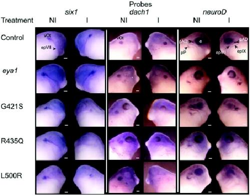 Figure 7. Expression of eya1 mutations that cause BOR in humans reduces otic expression of six1, dach and neuroDOne cell of a two-cell stage embryo was injected with mRNA encoding Eya1 protein. Stage 28 embryos were assayed for otic gene expression by in situ hybridization. In each pair of panels, the non-injected side (NI) of the embryo is shown on the left and the side injected with mRNA (I) is on the right. The otic vesicle (vOt), facial epibranchial placode (epVII and epIX), glossopharyngeal epibranchial placode, anterior lateral line placode (pAD), posterior lateral line placode (pP) and the eye (e) are noted. Scale bars, 200 μm. |