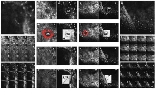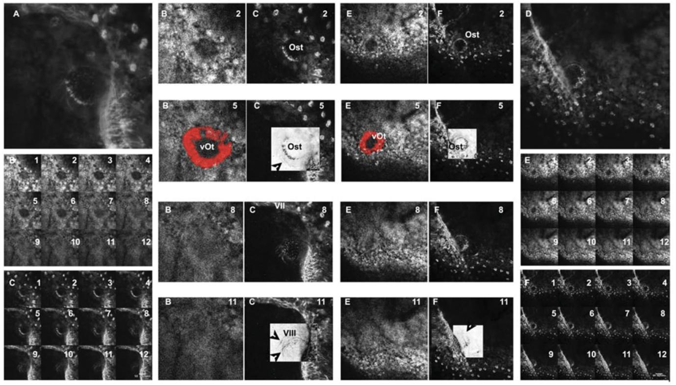 FigureS2 Whole mount imaging of the otic region of a stage 34 embryo that is expressing R435Q on its right side Images were captured starting from the dorsal-lateral area of the embryo and then moving in the ventral-medial direction. (A) A composite of stacks (B) and (C). (D) is a composite stack of (E) and (F). (B, E) Each image of a confocal stack using phalloidin. (C, F) Each image of a confocal stack detecting acetylated α-tubulin. Enlargements of companion images show how phalloidin staining highlights the otocyst (Ost) and allows an easy estimate of otic vesicle (vOt) size. The otic vesicle is coloured red in B 5 and E 5. The appearance of sensory tissue in the otocyst (Ost) can be seen in C and F 2, 5 and 8, with the greyscale image selectively inverted in C and F 5 and 11 with the inverted image showing sensory tissue as black. The position of the VII cranial nerve is indicated in C 8. In C 11 the neurites (arrowheads) between the sensory tissue and the VIII cranial nerve with the otocyst on the ventral medial side are detected in C but are barely visible in F. Arrowheads point to neurites associated with sensorial tissue and the VIII cranial nerve. Scale bars in (C) and (F), 50 μm.